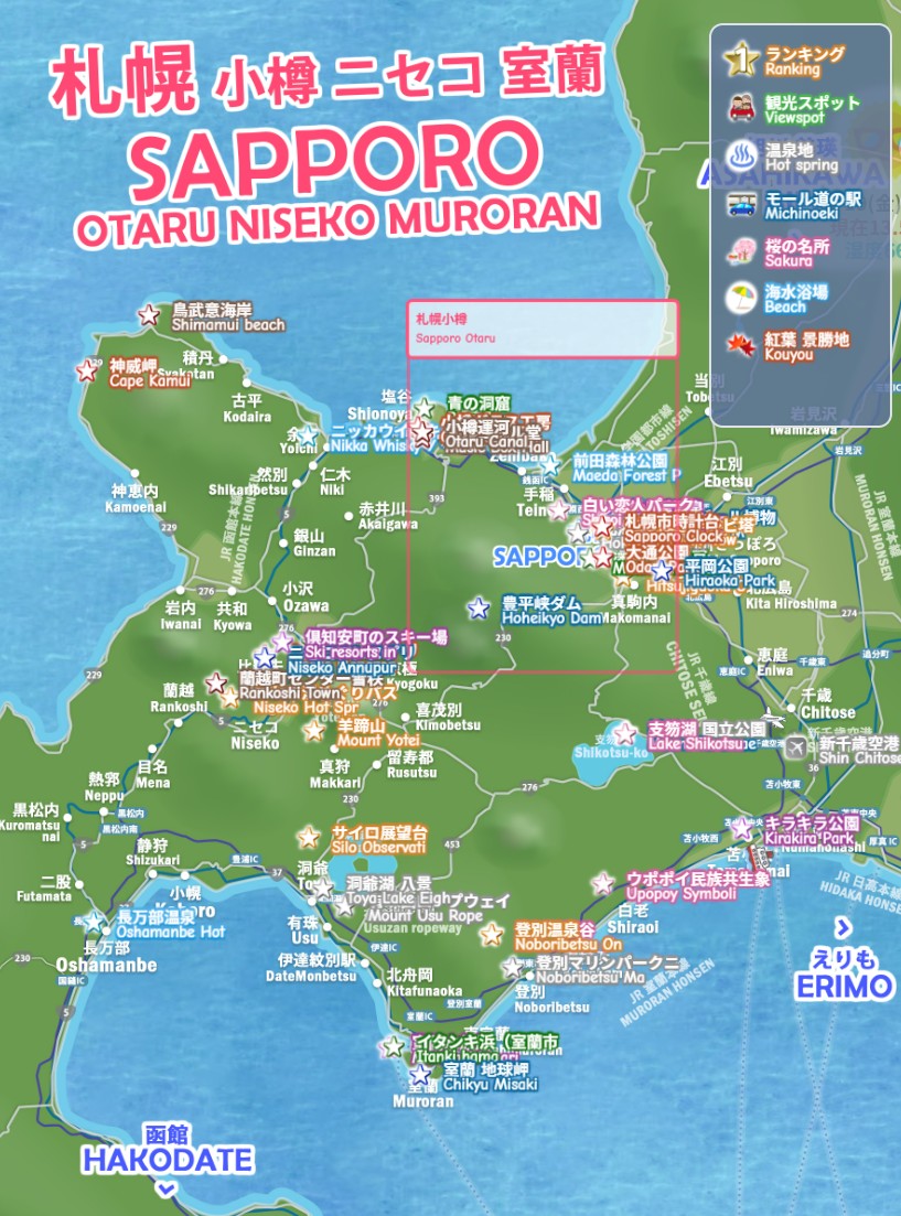 札幌・小樽・ニセコ・室蘭・苫小牧、札幌ニセコの観光スポット 穴場、わかりやすいデジタルマップをお作りしています。大通公園・藻岩山・円山公園・小樽運河・ニセコアンヌプリなど、行ってよかった絶景モデルコース、47都道府県の名所、電車でドライブで日帰りで行くお勧めルート2026を続々追加中です。