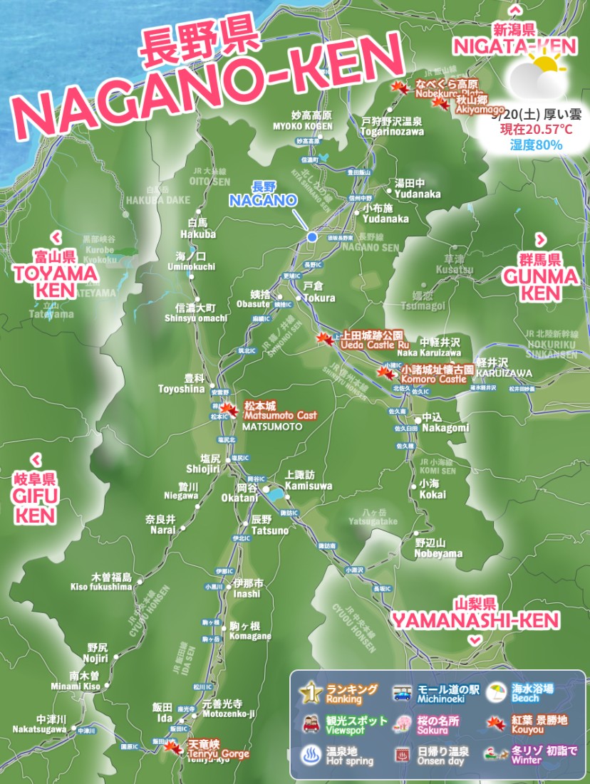 長野市・松本市・上田市・飯田市・諏訪市、長野県の秋の紅葉 景勝地、わかりやすいデジタルマップをお作りしています。上高地 乗鞍高原 戸隠高原 白駒の池 志賀高原など、行ってよかった絶景モデルコース、47都道府県の名所、電車でドライブで日帰りで行くお勧めルート2026を続々追加中です。