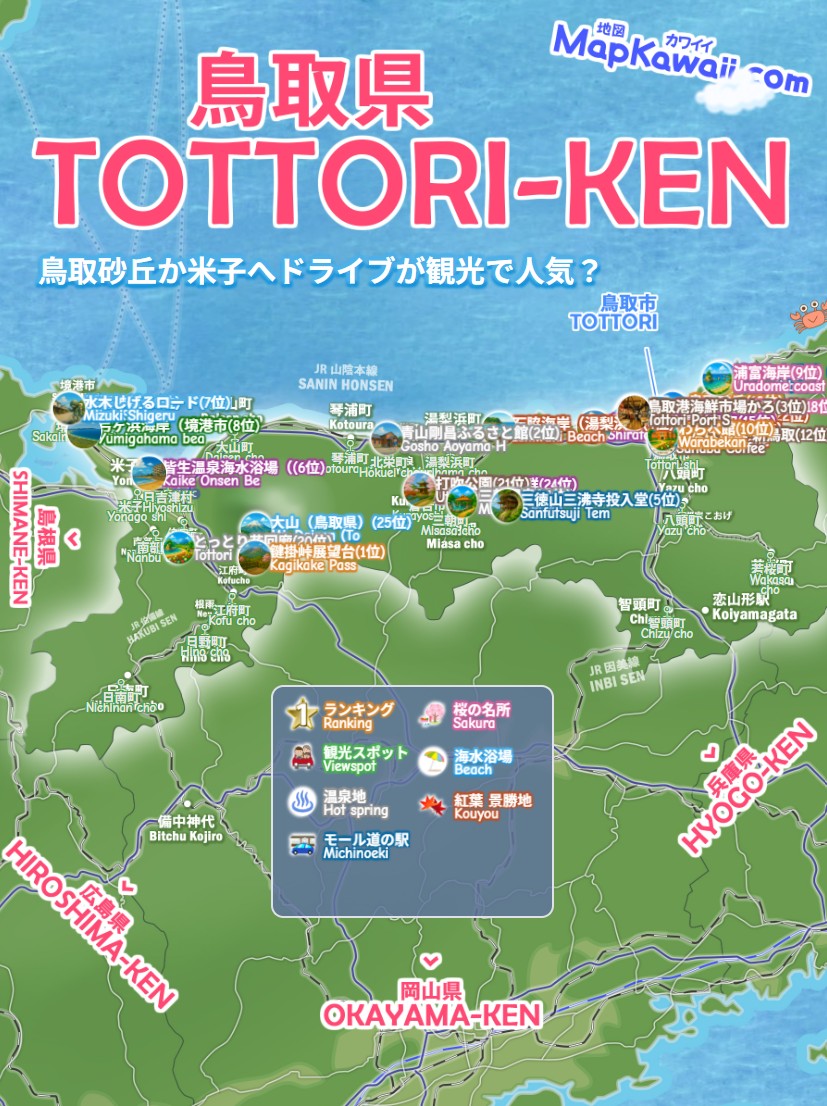 鳥取市・倉吉市・米子市、鳥取県のお勧め人気ランキング、わかりやすいデジタルマップをお作りしています。鳥取砂丘・水木しげるロード・大山・倉吉白壁土蔵群・米子城跡など、行ってよかった絶景モデルコース、47都道府県の名所、電車でドライブで日帰りで行くお勧めルート2026を続々追加中です。