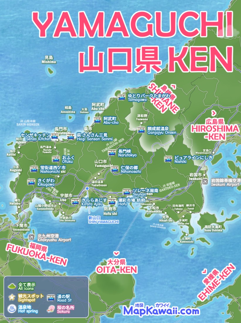 山口市・下関市・宇部市・岩国市・萩市、山口県の道の駅 ショッピングモール、わかりやすいデジタルマップをお作りしています。秋芳洞・錦帯橋・萩城跡・大島・角島など、行ってよかった絶景モデルコース、47都道府県の名所、電車でドライブで日帰りで行くお勧めルート2026を続々追加中です。