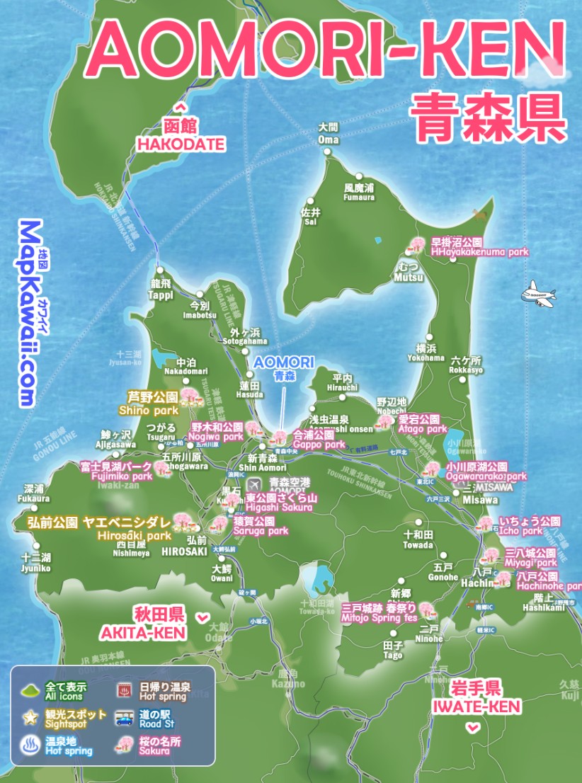 青森・弘前・八戸・十和田、青森県の桜の名所 お花見、わかりやすいデジタルマップをお作りしています。奥入瀬渓流・十和田湖・弘前城・八甲田山・恐山・浅虫温泉・三内丸山遺跡など、行ってよかった絶景モデルコース、47都道府県の名所、電車でドライブで日帰りで行くお勧めルート2026を続々追加中です。