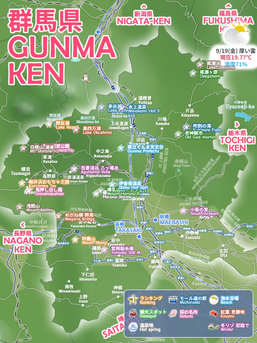 前橋市・高崎市・伊勢崎市、群馬県の観光スポット 穴場、わかりやすいデジタルマップをお作りしています。草津温泉・四万温泉・万座温泉・伊香保温泉・榛名湖・赤城山など、今すぐ行きたい絶景モデルコース、電車でドライブで日帰りで行くお勧めルート2026を続々追加中です。