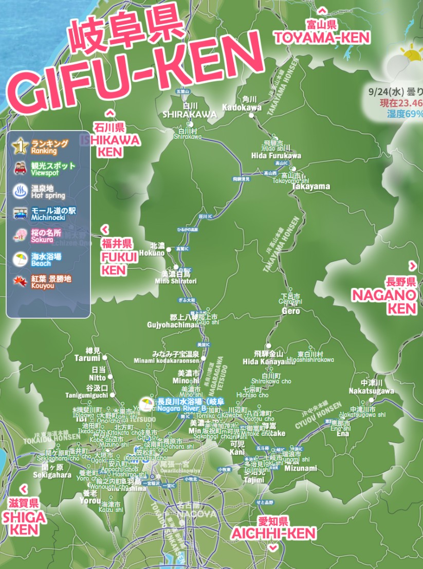 岐阜市・高山市・大垣市・多治見市・下呂市、岐阜県の海水浴場 プール、わかりやすいデジタルマップをお作りしています。長良川・付知峡・馬瀬川・板取川・阿木川湖など、今すぐ行きたい絶景モデルコース、電車でドライブで日帰りで行くお勧めルート2026を続々追加中です。