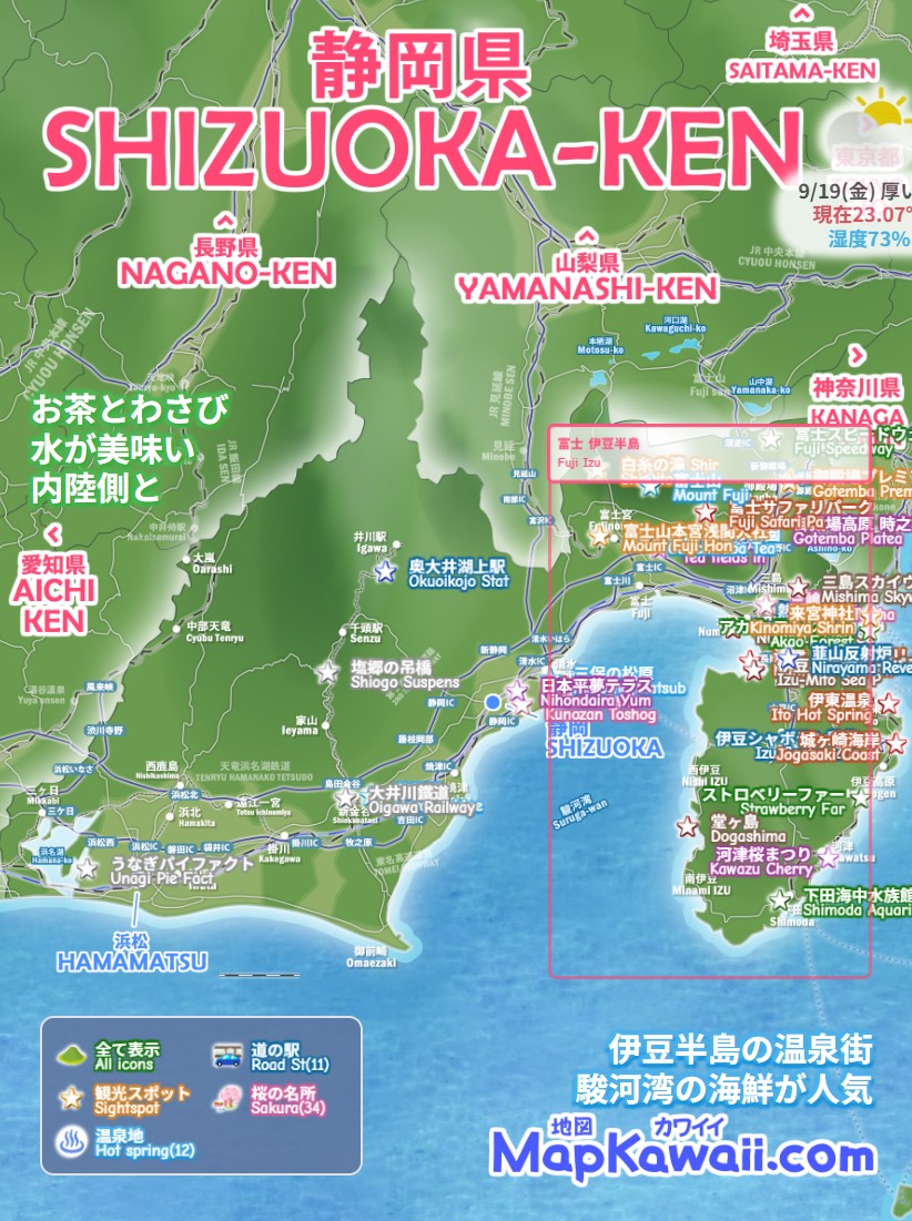 静岡市・浜松市・沼津市・熱海市・伊豆市、静岡県の観光スポット 穴場、わかりやすいデジタルマップをお作りしています。富士山 伊豆の国パノラマパーク 三島スカイウォーク 竜ヶ岩洞など、今すぐ行きたい絶景モデルコース、電車でドライブで日帰りで行くお勧めルート2026を続々追加中です。