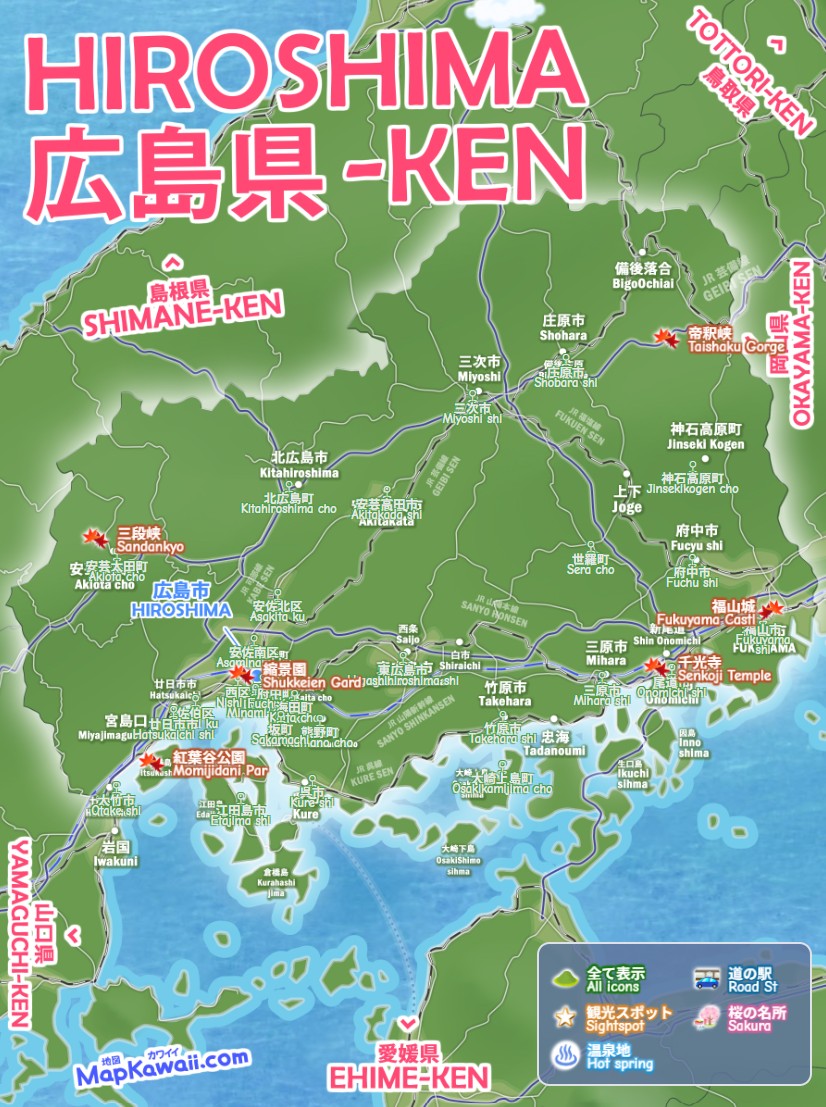 広島市・福山市・呉市・尾道市・廿日市市、広島県の秋の紅葉 景勝地、わかりやすいデジタルマップをお作りしています。宮島 三段峡 帝釈峡 世羅高原農場 呉市音戸の瀬戸など、行ってよかった絶景モデルコース、47都道府県の名所、電車でドライブで日帰りで行くお勧めルート2026を続々追加中です。