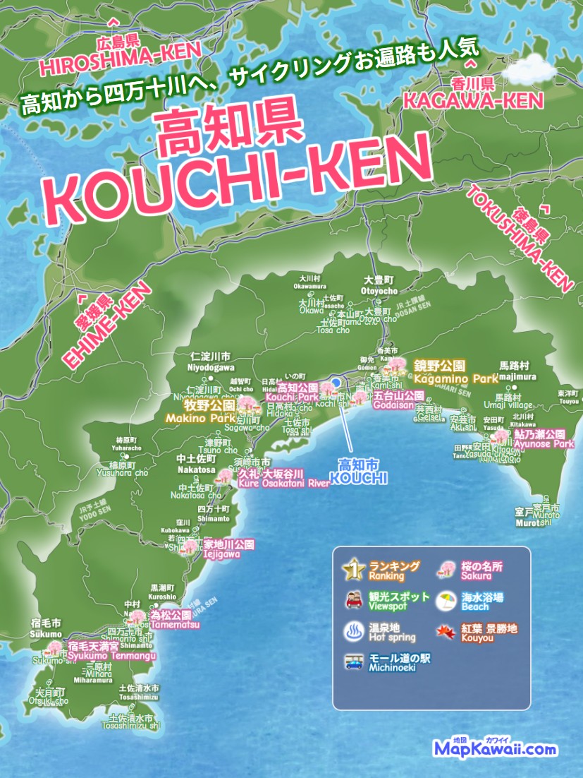 高知市・南国市・土佐市・須崎市・香南市、高知県の桜の名所 お花見、わかりやすいデジタルマップをお作りしています。桂浜・高知城・坂本龍馬記念館・四万十川・仁淀川など、今すぐ行きたい絶景モデルコース、電車でドライブで日帰りで行くお勧めルート2026を続々追加中です。