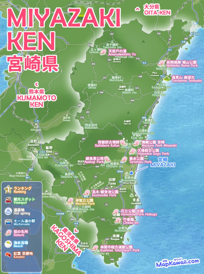 宮崎市・都城市・延岡市・日南市・小林市、宮崎県の桜の名所 お花見、わかりやすいデジタルマップをお作りしています。高千穂峡・霧島温泉・青島神社・日南海岸・都井岬など、今すぐ行きたい絶景モデルコース、電車でドライブで日帰りで行くお勧めルート2026を続々追加中です。