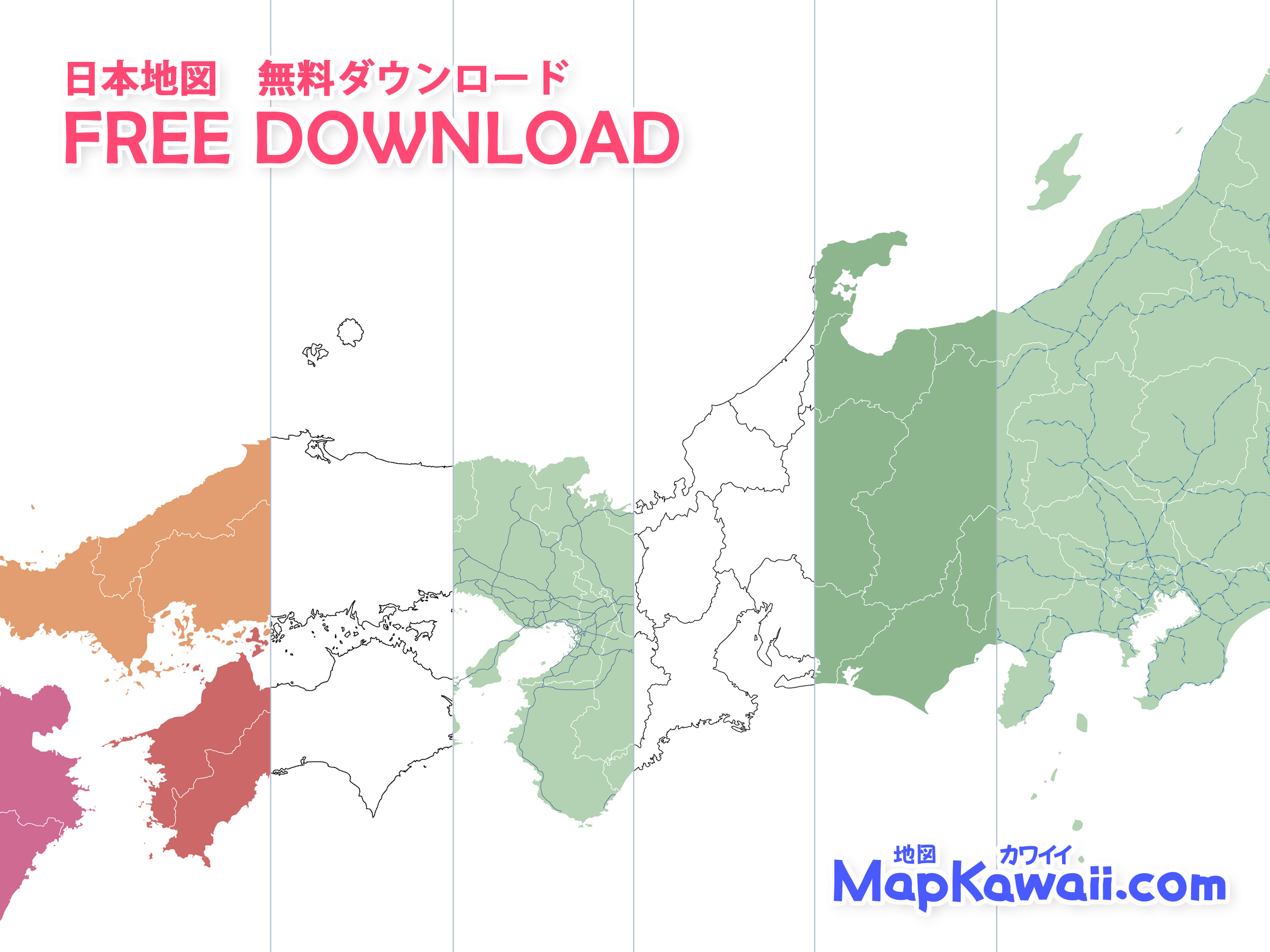かわいいマップオリジナルの見やすい地図データ画像です。JPG、透過PNG、PDF形式、イラストレーターai形式、高画質版まで無料でダウンロード出来ます。県境なしの白地図や都道府県がフリーで商用利用もOK、見やすい地域別で色塗りの地図も人気。