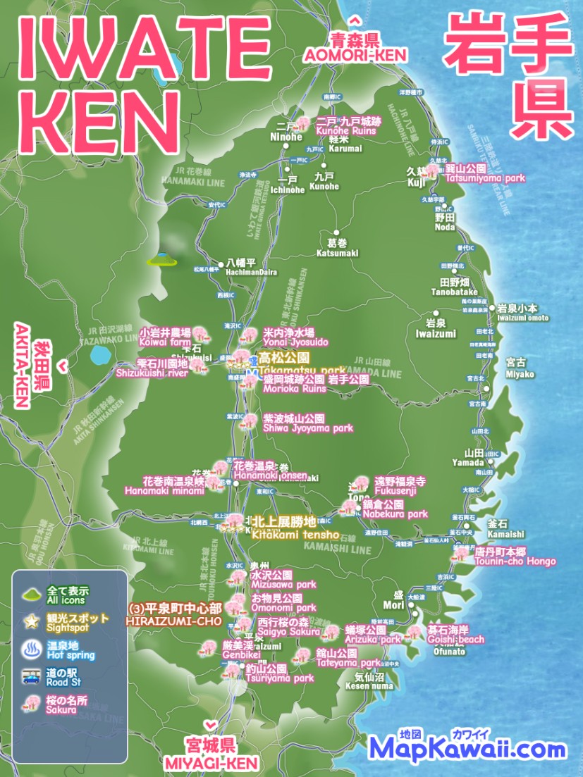 盛岡・一関・北上・花巻、岩手県の桜の名所 お花見、わかりやすいデジタルマップをお作りしています。浄土ヶ浜・龍泉洞・小岩井農場・中尊寺金色堂・厳美渓・猊鼻渓・遠野の風景・達谷窟毘沙門堂・八幡平・安比高原・鶯宿温泉・花巻温泉・つなぎ温泉など、今すぐ行きたい絶景モデルコース、電車でドライブで日帰りで行くお勧めルート2026を続々追加中です。