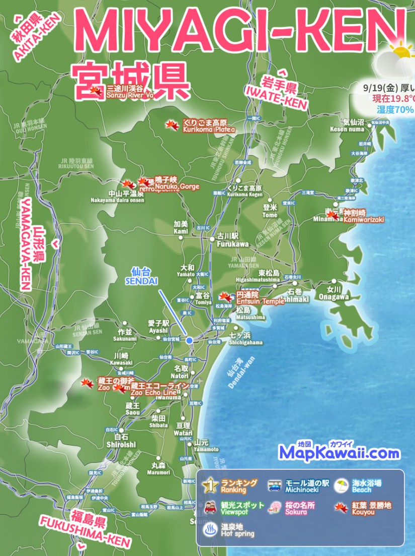 仙台・石巻・気仙沼・白石、宮城県の秋の紅葉 景勝地、わかりやすいデジタルマップをお作りしています。鳴子峡 秋保大滝 円通院 瑞鳳殿 定義如来西方寺 蔵王エコーライン 鳳鳴四十八滝 磊々峡など、今すぐ行きたい絶景モデルコース、電車でドライブで日帰りで行くお勧めルート2026を続々追加中です。