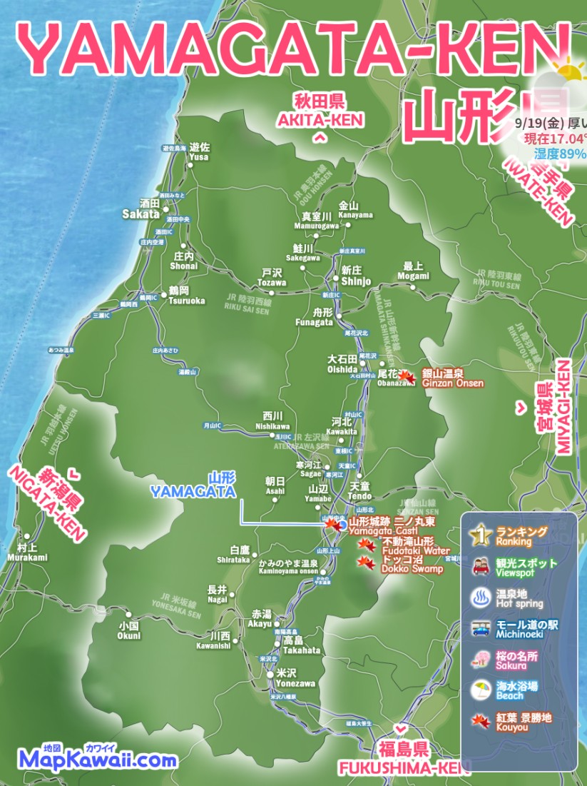 山形・米沢・酒田・鶴岡、山形県の秋の紅葉 景勝地、わかりやすいデジタルマップをお作りしています。蔵王温泉 銀山温泉 山寺(立石寺) 月山 最上峡 赤芝峡 滑川温泉 面白山紅葉川渓谷 眺海の森など、今すぐ行きたい絶景モデルコース、電車でドライブで日帰りで行くお勧めルート2026を続々追加中です。