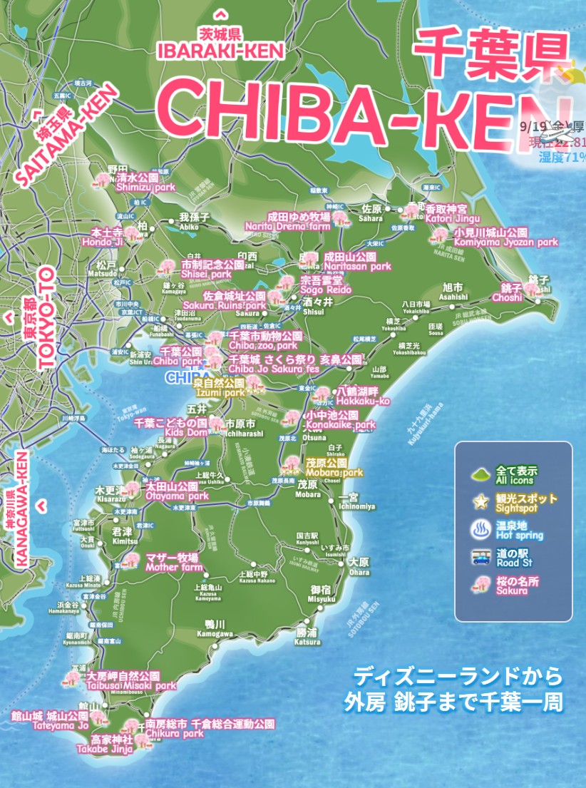 木更津・鴨川・成田、千葉県の桜の名所 お花見、わかりやすいデジタルマップをお作りしています。千葉で遊ぶところ、大人でのおもしろいスポット。ドライブに日帰りにディズニー以外の穴場、成田・香取・九十九里・館山・勝浦・白浜・御宿・銚子など、今すぐ行きたい絶景モデルコース、電車でドライブで日帰りで行くお勧めルート2026を続々追加中です。