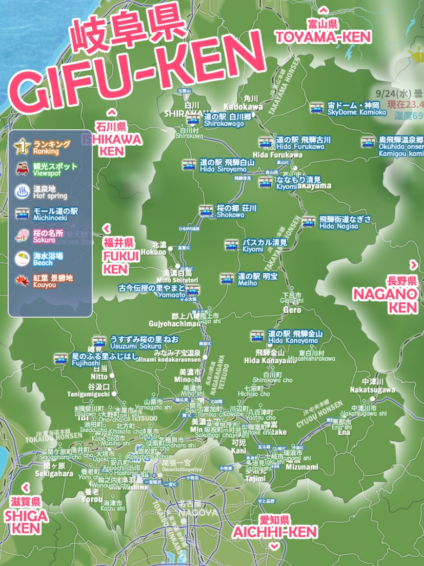 岐阜市・高山市・大垣市・多治見市・下呂市、岐阜県の道の駅 ショッピングモール、わかりやすいデジタルマップをお作りしています。新穂高ロープウェイ・白川郷・曽木公園・養老公園・付知峡など、今すぐ行きたい絶景モデルコース、電車でドライブで日帰りで行くお勧めルート2026を続々追加中です。