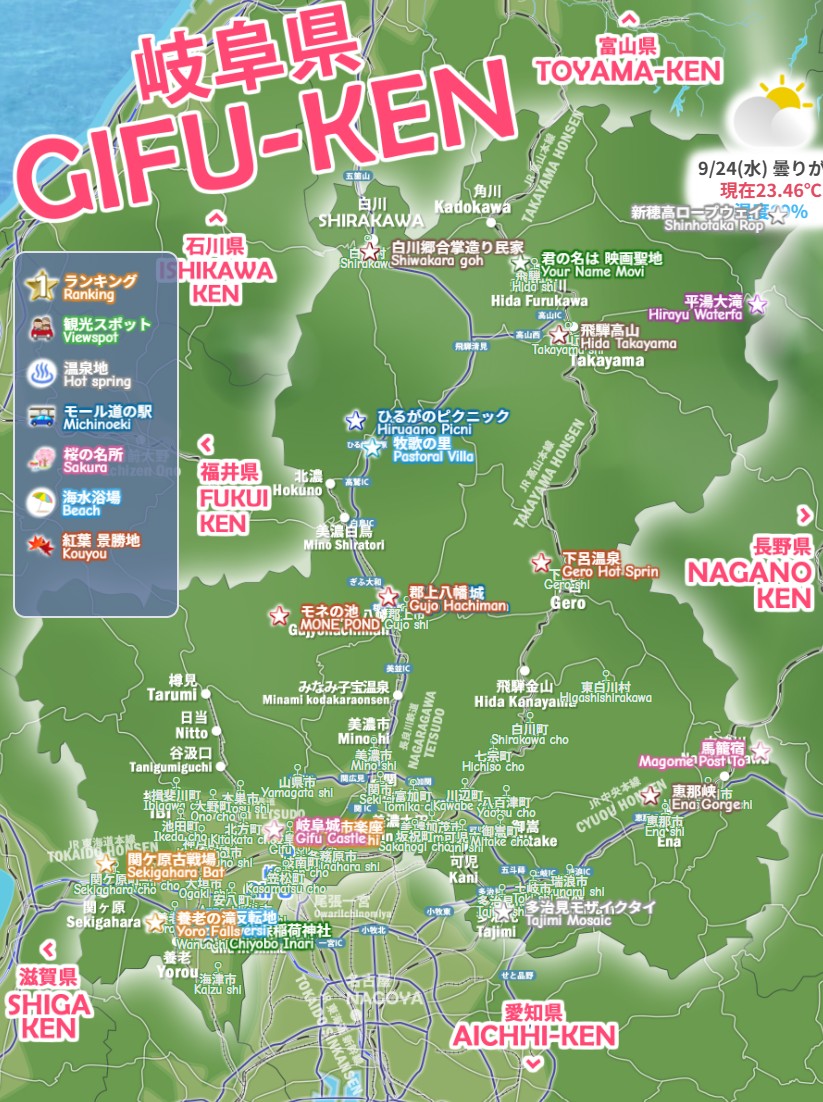岐阜市・高山市・大垣市・多治見市・下呂市、岐阜県の観光スポット 穴場、わかりやすいデジタルマップをお作りしています。新穂高ロープウェイ・白川郷・曽木公園・養老公園・付知峡など、今すぐ行きたい絶景モデルコース、電車でドライブで日帰りで行くお勧めルート2026を続々追加中です。