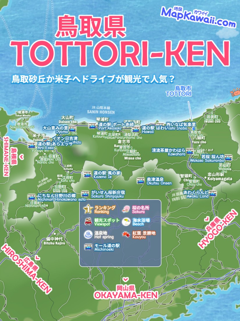 鳥取市・倉吉市・米子市、鳥取県の道の駅 ショッピングモール、わかりやすいデジタルマップをお作りしています。鳥取砂丘・水木しげるロード・大山・倉吉白壁土蔵群・米子城跡など、今すぐ行きたい絶景モデルコース、電車でドライブで日帰りで行くお勧めルート2026を続々追加中です。