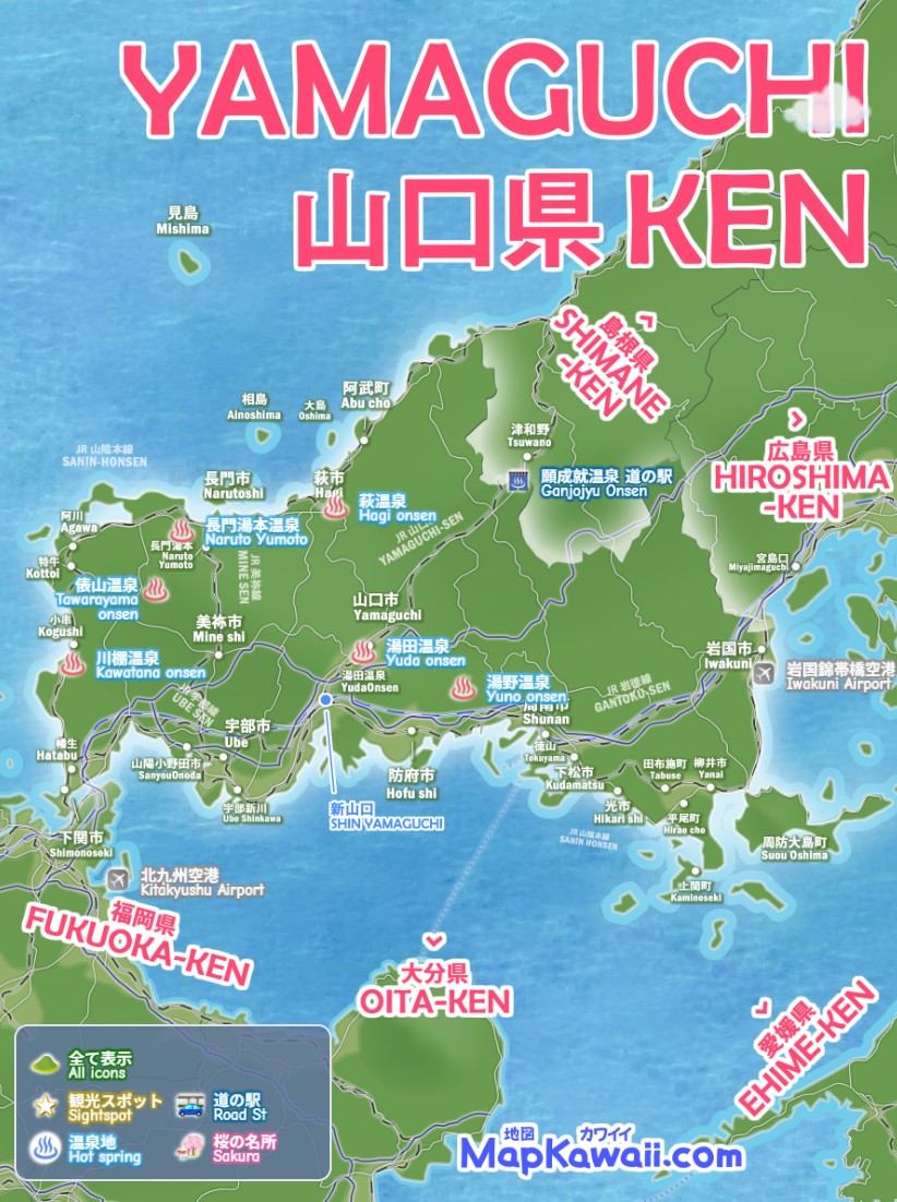 山口市・下関市・宇部市・岩国市・萩市、山口県の温泉街 温泉地、わかりやすいデジタルマップをお作りしています。秋芳洞・錦帯橋・萩城跡・大島・角島など、今すぐ行きたい絶景モデルコース、電車でドライブで日帰りで行くお勧めルート2026を続々追加中です。