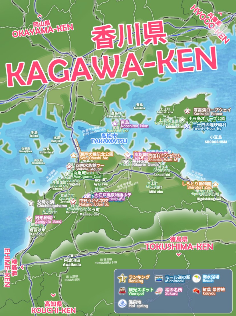 高松市・丸亀市・坂出市・観音寺市・善通寺市、香川県の観光スポット 穴場、わかりやすいデジタルマップをお作りしています。栗林公園・屋島・金刀比羅宮・大窪寺・寒霞渓など、今すぐ行きたい絶景モデルコース、電車でドライブで日帰りで行くお勧めルート2026を続々追加中です。