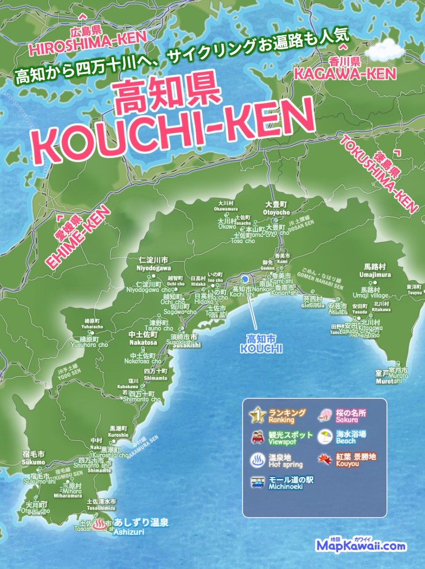 高知市・南国市・土佐市・須崎市・香南市、高知県の温泉街 温泉地、わかりやすいデジタルマップをお作りしています。桂浜・高知城・坂本龍馬記念館・四万十川・仁淀川など、今すぐ行きたい絶景モデルコース、電車でドライブで日帰りで行くお勧めルート2026を続々追加中です。