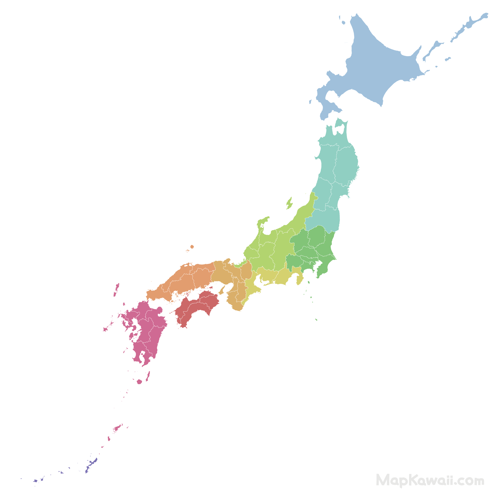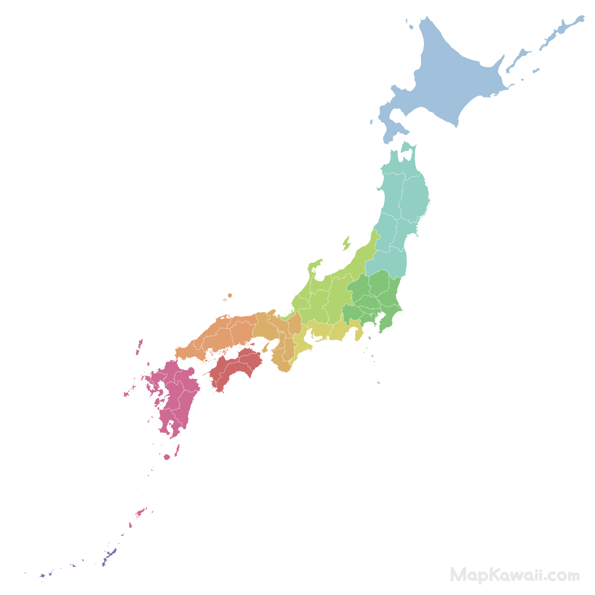 かわいいマップオリジナルの地図データです。JPG、透過PNG、PDF形式、イラストレーターai形式、高画質版まで無料でダウンロード出来ます。県境なしの白地図や都道府県がフリーで商用利用もOK、見やすい地域別で色塗りの地図も人気。